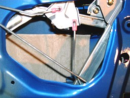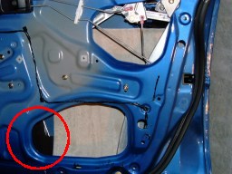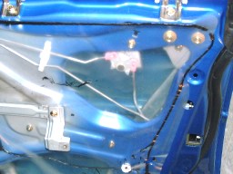 | ↑内張を取って、更に防水用のビニールも剥がす。 まず、こうやってボディーの裏側 (パネルの内側) に制振シートを適度な大きさに切ってから貼っていく。(写真・右) パネルの内側用の制振シートは、ベージュ色のシートだ。 このシートはトタン屋根の防音にも使われるほどの スグレモノで、振動を抑えるだけでなく防音効果も高い。 |