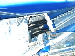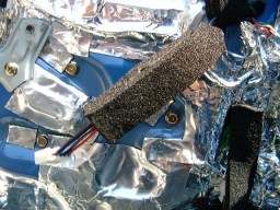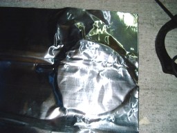 | ↑パネルの内側がひと通り貼れたら、今度はパネルの表面だ。(写真・左) 貼る前に、貼る部分に押し当てて、形取ってから切り抜くと、キレイに貼る事ができるぞ!(写真・右) パネル用は、銀色のシートだ。 ちゃんと貼る場所に合わせてシートの質を変えて2種類入っているのが泣かせるねぇ!(笑) |