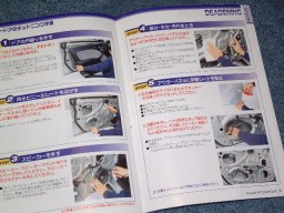 | ↑こちらもインナーバッフルボードと同様に、必要なモノは全て入っている超親切セットだ。(笑) 驚いちゃうのは、なんと言っても解説ビデオだね! これならどんなに知らない人でも確実に施工可能だ。 カー用品店の店頭に置いてあるタダでもらえる小冊子にも、詳しく写真入りで解説されている。(写真・中央/右) この小冊子に載っているクルマはおそらくスバルのクルマだね。(笑) ドアパネルの形状がインプレッサによく似ているので デッドニングするのにかなり役に立つ! |